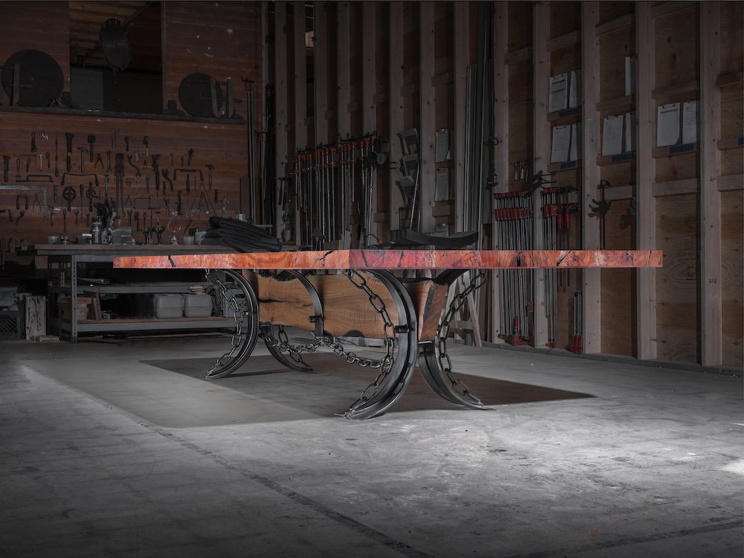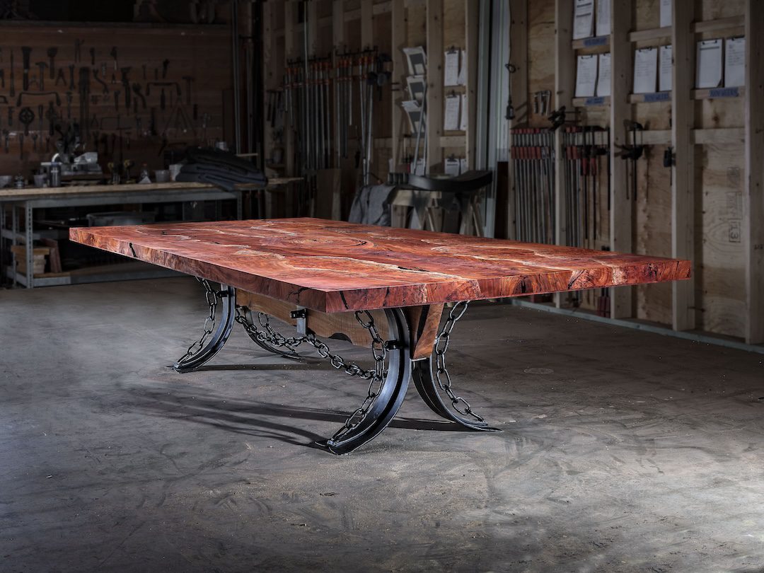 At 3″ thick, the top feels bold and grounded, while the custom steel and chain base adds a modern edge without taking away from the warmth of the wood.